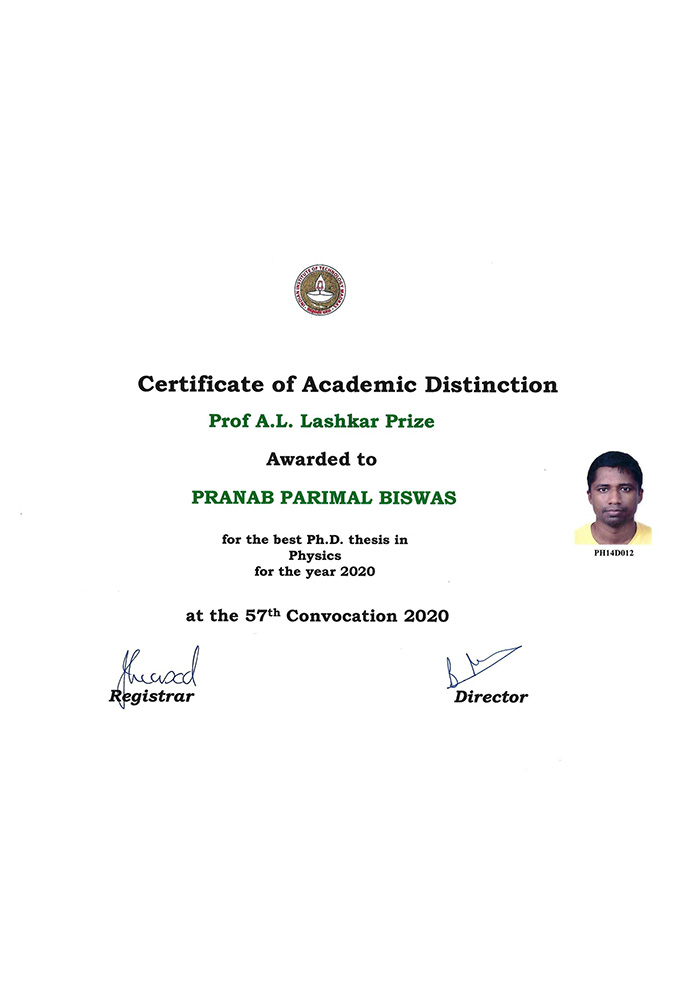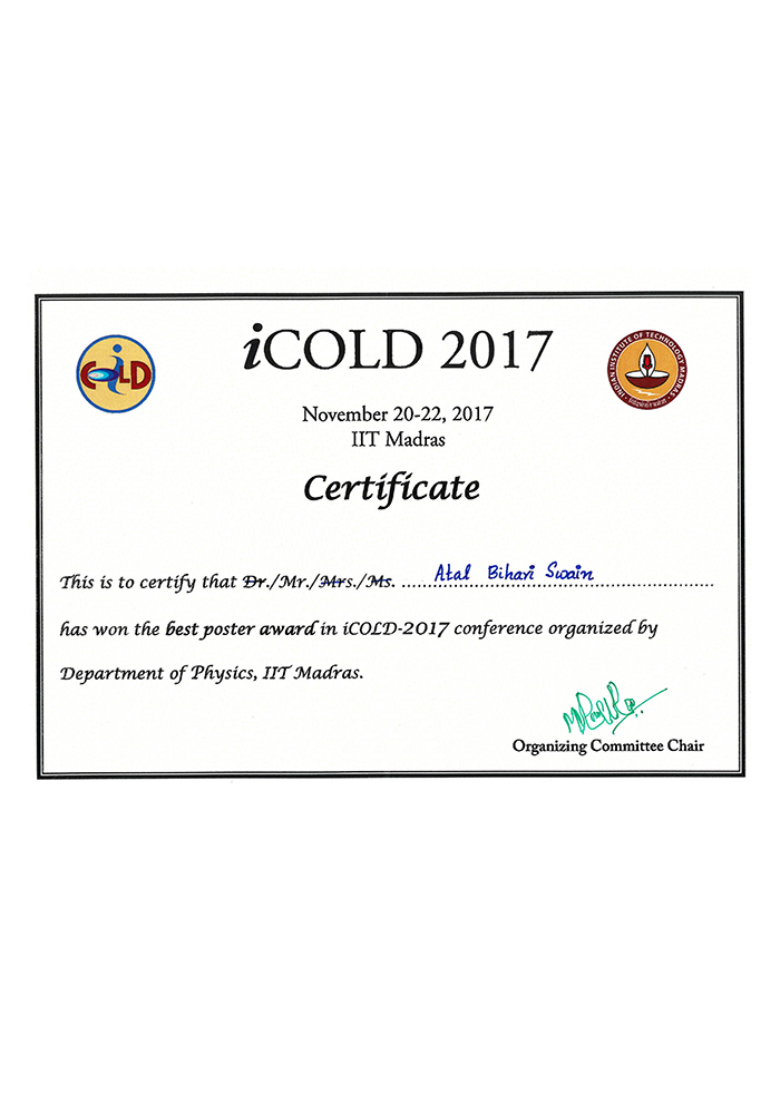 Award at International Conference in Laser Deposition (iCOLD), held during June, 2017 at Indian Institute of Technology, Madras.