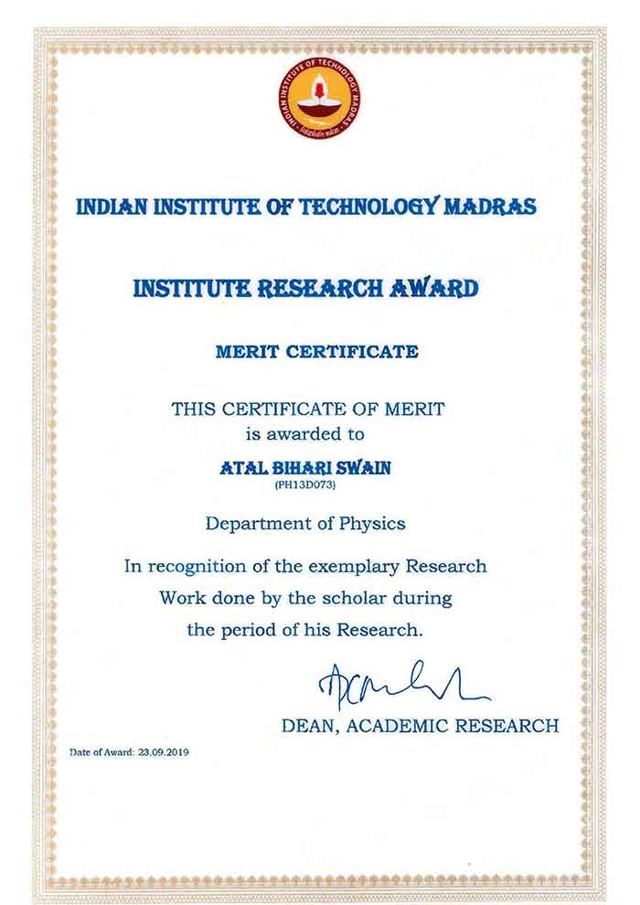 (In recognition of the exemplary Research work done by the scholar during the period of research) during 2019.