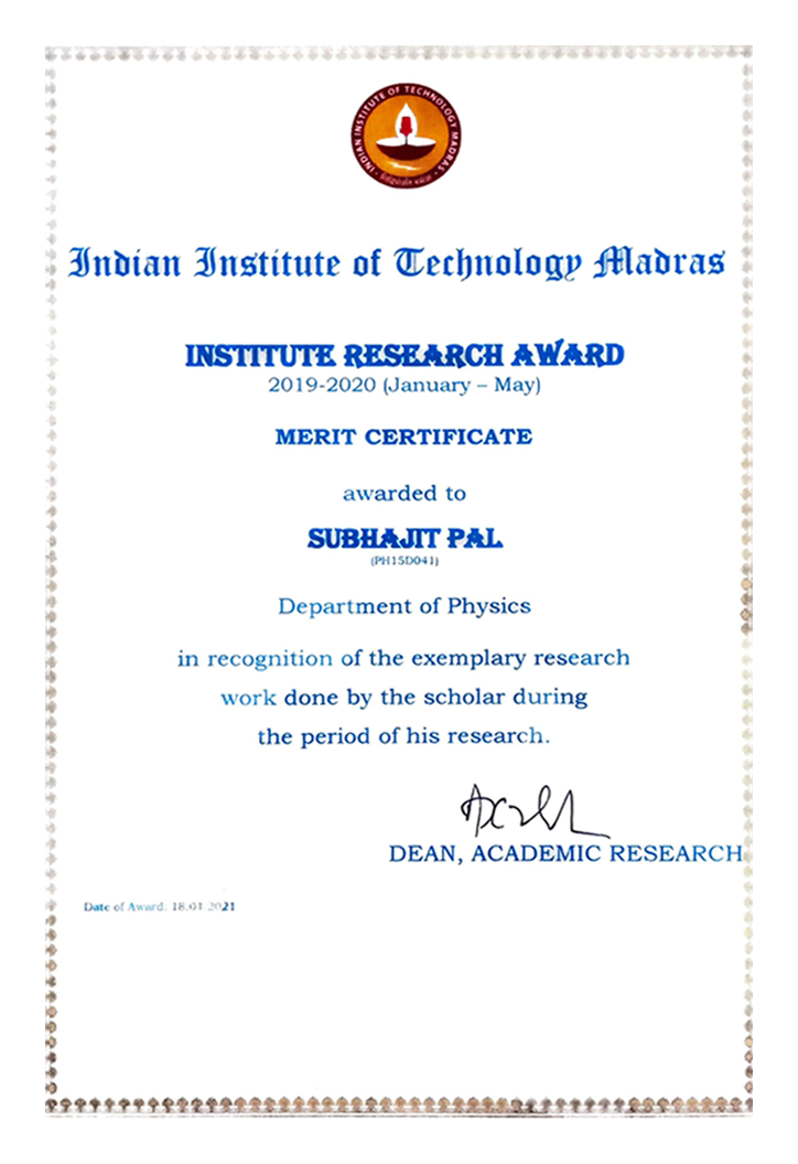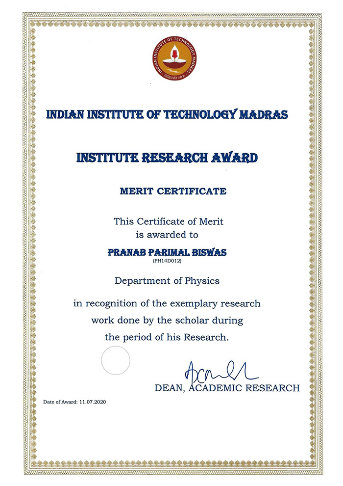 (In recognition of the exemplary Research work done by the scholar during the period of research) during 2020.